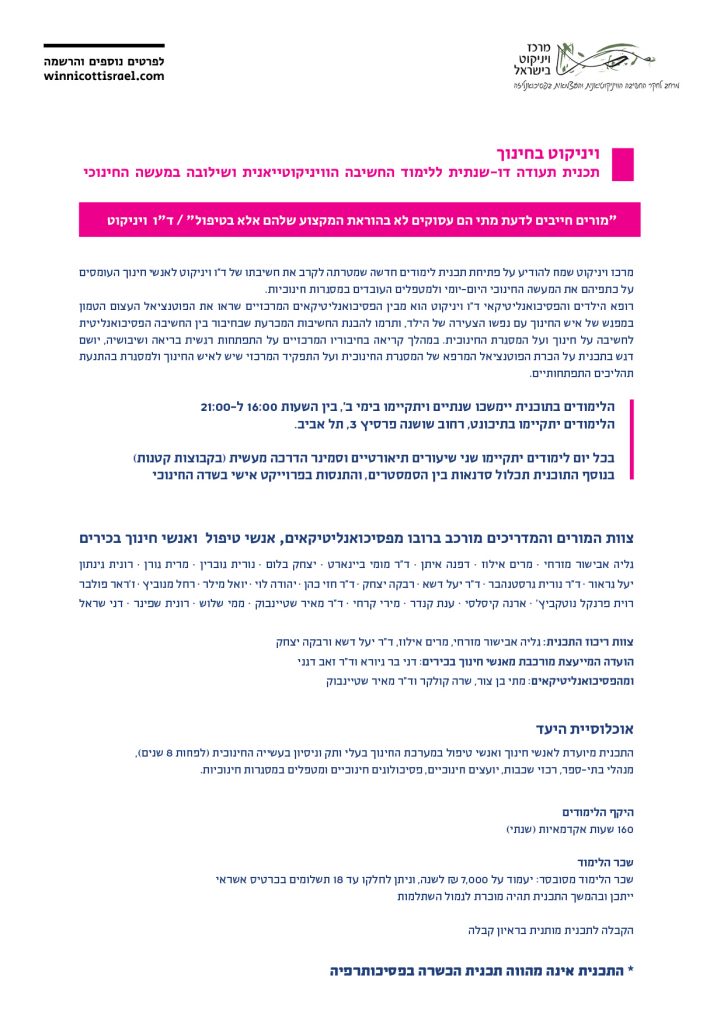 תכנית חדשה לאנשי חינוך: ויניקוט בחינוך