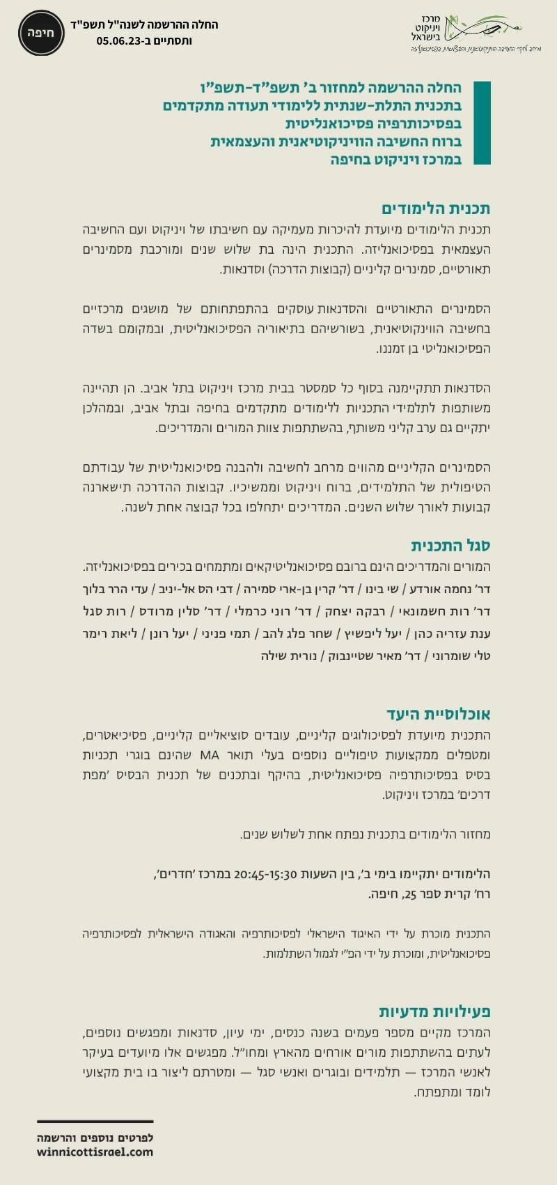 הרשמה ללימודי תעודה מתקדמים בחיפה בפסיכותרפיה פסיכואנליטית